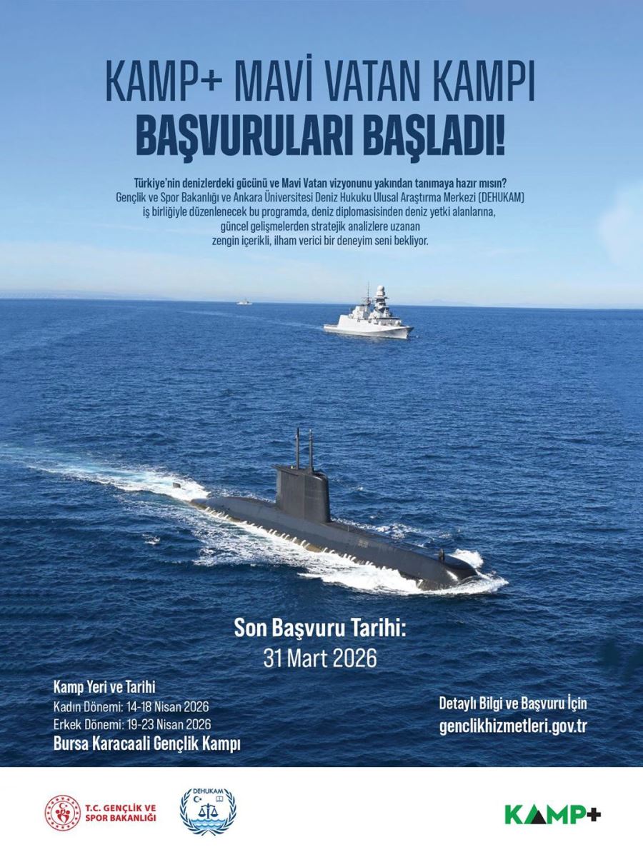 Deniz Hukuku Ulusal Araştırma Merkezi (DEHUKAM) ile T.C. Gençlik ve Spor Bakanlığı Gençlik Hizmetleri Genel Müdürlüğü iş birliğinde, gençlerin ülkemizin deniz hakları konusunda bilinçlenmesi ve "Mavi Vatan" vizyonunu yakından tanıması amacıyla 14-23 Nisan 2026 tarihleri arasında Bursa Karacaali Gençlik Kampı'nda "